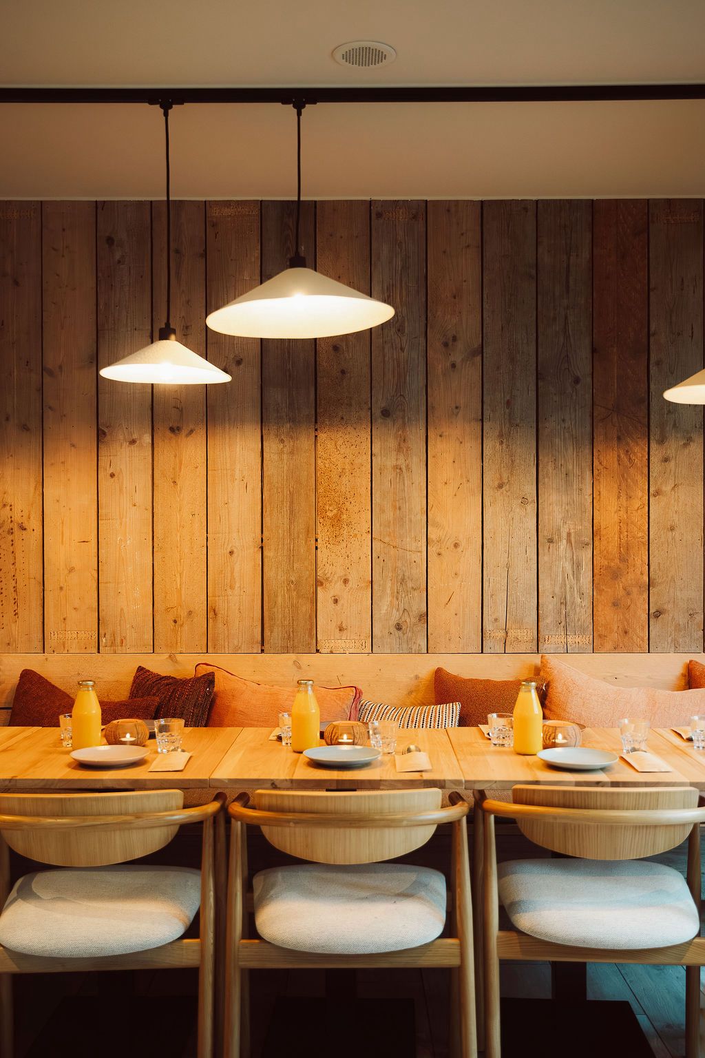 Knap lijnenspel van eiken stoelen horeca met zachte bekleding en comfortabele armleuning. De achterwand in hout zorgt voor extra warmte, terwijl de zwarte onderstellen van de tafels een modern accent toevoegen aan deze huiselijke inrichting restaurant.