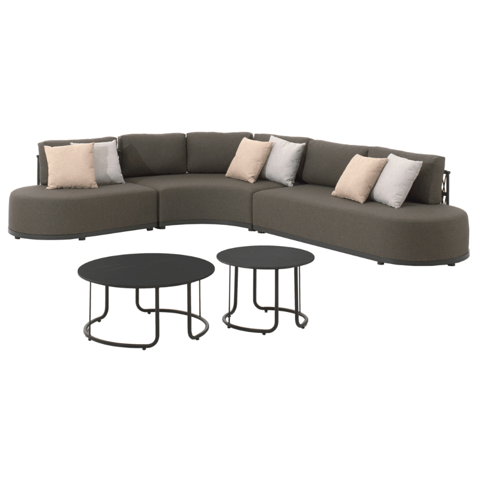 De set wordt aangevuld met twee ronde salontafels in verschillende hoogtes (ø81 h37 en ø60 h41). Beide tafels zijn uitgevoerd met een keramisch tafelblad dat niet alleen krasvast en onderhoudsvriendelijk is, maar ook een luxueuze uitstraling geeft. Het onderstel in charcoal aluminium sluit perfect aan bij het design van de zitmodules.
