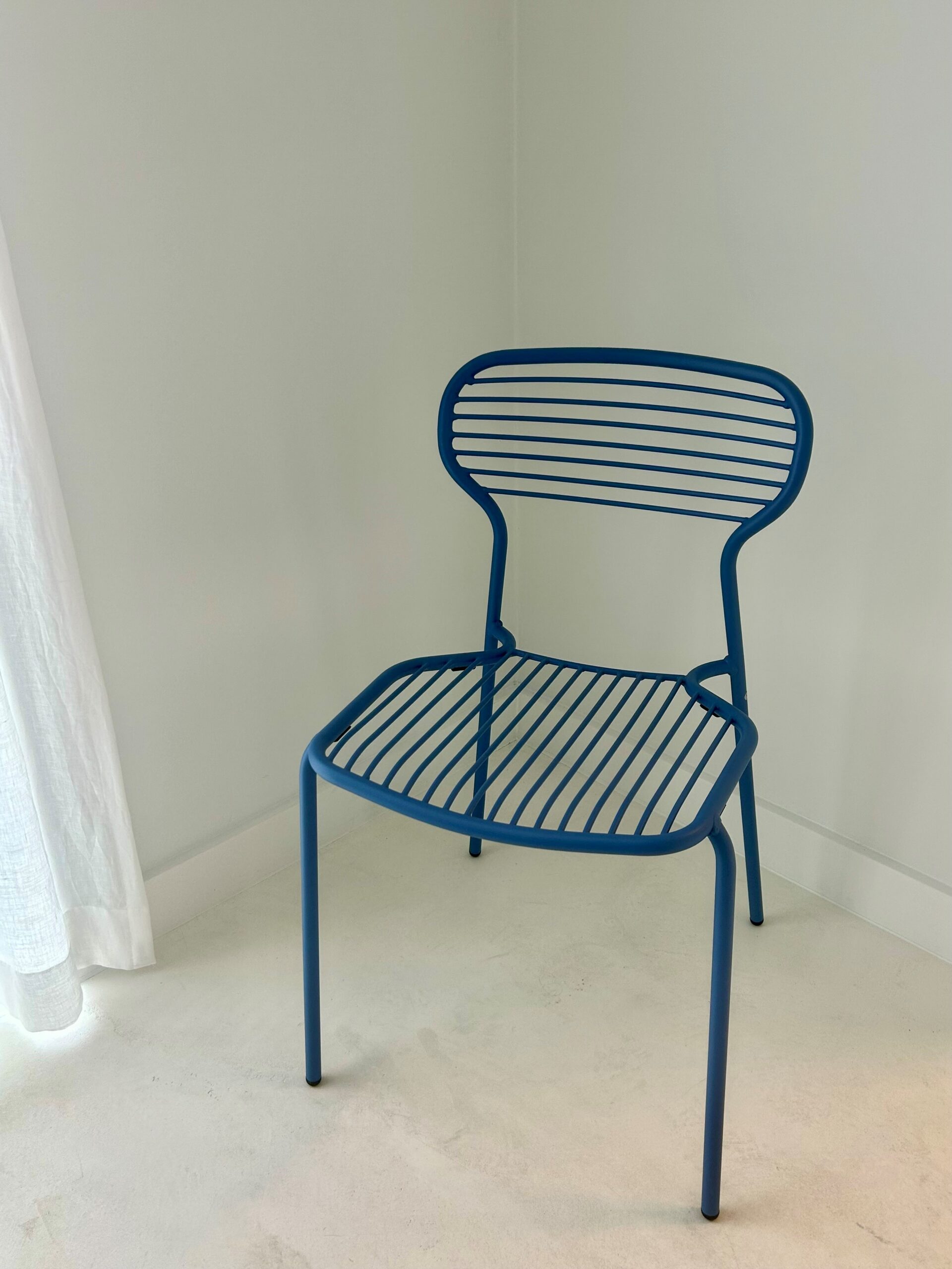 De Apero terrasstoel is een lichtgewicht designstoel met een luchtige uitstraling. Het blauwe metalen frame met fijne lattenstructuur zorgt voor een frisse, moderne sfeer op elk terras. Deze outletset bevat 8 stuks met lichte gebruikssporen, exclusief als één lot.